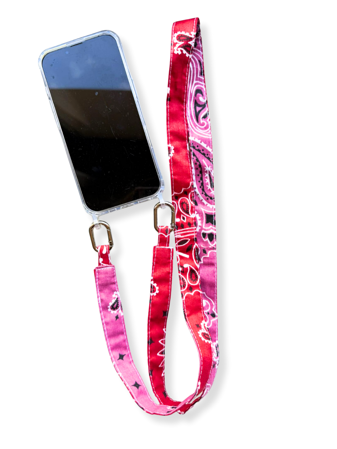 Apportez une touche de caractère à votre téléphone avec cette anse bicolore en tissu bandana, à la fois pratique et stylée.